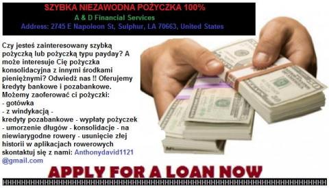 Czy prowadzisz firmę, która potrzebuje finansowania lub potrzebujesz pieniędzy z powodów osobistych, takich jak; Konsolidacja zadłużenia, opłaty szkolne, zakup nieruchomości, takiej jak samochód, dom, uzyskanie opieki medycznej itp.? Oferujemy szeroki zakres finansowania firmom i osobom, które potrzebują pomocy finansowej lub wsparcia dla różnych celów prawnych.