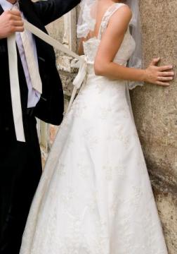 Mam do sprzedania piękną i elegancką suknię ślubną w kolorze mlecznego ecru (najjaśniejszy odcień ecru). Suknia pokryta jest koronką w tym samym kolorze, ornamenty dodatkowo ozdobione są platynową nicią. Ponadto na pasku pod biustem wykonano ozdobę z kryształów Swarowskiego. Zdobienia te pieknie komponują sie z platynowa/ srebrną biżuterią.