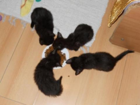 Kotki jedzą samodzielnie karmę suchą i mokrą, potrafią korzystać z kuwety. Są odrobaczone i w najbliższym czasie będą zaszczepione. Jedna koteczka ma futerko idealnie czarne, kocurek i druga kicia są czarno-dymno-pręgowane. Są bardzo proludzkie, rozmruczane, szybko aklimatyzują się w nowym otoczeniu.