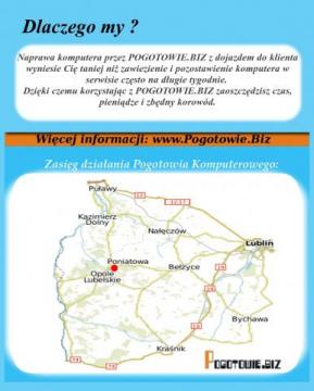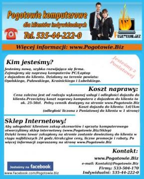 Jesteśmy nową, szybko rozwijająca się firma. Biuro firmy znajduje się w Poniatowej.Zajmujemy się naprawą i opieką nad komputerami klientów indywidualnych jak i firm.Działamy na terenie powiatu: Opolskiego, Puławskiego, Kraśnickiego i Lubelskiego.