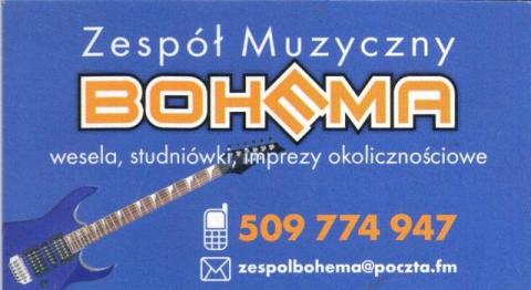 Zespół "BOHEMA". Oferujemy profesjonalną oprawę muzyczną przyjęć : - weselnych, - dancingów, - balów sylwestrowych, - studniówkowych, - imprez firmowych, - i innych spotkań okolicznościowych. Muzyka którą państwu oferujemy, to muzyka dla każdego pokolenia. Dzięki dużemu doświadczeniu, bogatemu repertuarowi i pomysłowości, zapewniamy zabawę na najwyższym poziomie. Rozpoczęliśmy działalność w latach 90 i od tego czasu funkcjonujemy na rynku muzycznym. Skład tworzą pasjonaci muzyki : perkusista-wokal, klawiszowiec-akordeonista-wokal, gitarzysta-wokal, jeśli istnieje potrzeba -wokalistka. Nasz szeroki repertuar zaspokoi 100% oczekiwania każdego klienta. Posiadamy wysokiej klasy markowe instrumenty bez których nie ma mowy o dobrej jakości brzmienia a także profesjonalne nagłośnienie i oświetlenie. Mając na uwadze nasze ambitne podejście do muzyki, stale pracujemy nad poszerzaniem repertuaru zarówno o najnowsze hity, jak i utwory lat 60-tych, 70-tych, 80-tych. Inwestujemy w najlepszy sprzęt na rynku. Na życzenie gramy akustycznie pod domem państwa młodych bez dodatkowych opłat. Ubarwiamy na różne sposoby nasz kontakt z publicznością, aby "Bohema" utożsamiała się wszystkim zawsze z dobrą zabawą. Serdecznie zapraszamy do współpracy. Więcej o nas na stronie: http://www.planujemywesele.pl/22260-bohema