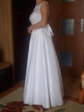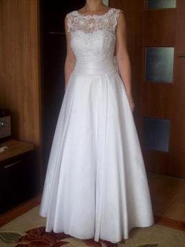 Sprzedam piękną białą suknię ślubną, szytą w salonie sukien ślubnych w Lublinie na rozmiar 34/36 oraz wzrost 156 cm + 9 cm na obcas. Góra z gipiury obszytej delikatnymi perełkami, dekolt w łódkę, wszyty biustonosz. Tył zapinany na guziczki, efektowna kokarda dodaje uroku całej sukni. Dół uszyty z dobrej jakości włoskiego materiału w kontrafałdy, które nadają idealny kształt. Do sukni dołączam halkę (halka nie posiada koła) oraz szal. Suknia jest bardzo wygodna, niezniszczona. Chętnie odpowiem na wszelkie pytania, zapraszam również do przymiarki. adres e-mail: mkopron@gmail.com