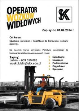 Firma SKK Sp. z o.o od prawie 20 lat zajmuje się prowadzeniem szkoleń i kursów specjalistycznych. Obecnie chcielibyśmy przedstawić Państwu ofertę kursu na operatora wózków widłowych, który rozpocznie się 3 kwietnia 2014 r. w Lublinie.