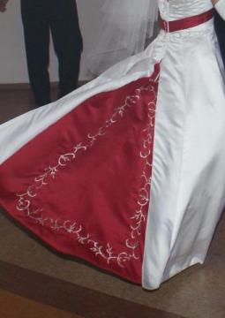 sprzedam oryginalna sliczna suknie slubna w stanie bardzo dobrym. suknia jest na halce w ksztalcie kola przez co pieknie sie układa. Tyl sukienki ma piekny klin z czerwonego materialu z ozdobnymi srebrymi haftami. Przod sukienki zdobiony jest czerwona szarfa wokół której również sa piekne zdobienia srebrnymi haftami z ozdobnymi koralikami. Na dole sukienki jest delikatny srebrny haft z koralikami przez co ladnie całość się komponuje z gora sukienki.
