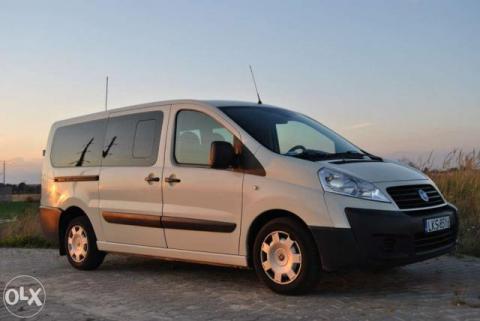 Auto to dynamiczny Fiat Scudo 2.0 MultiJet 120Km z 2007r.9-osobowy z klimatyzacją,odtwarzaczem DVD z dwoma ekranami 7" i 17",lodówką lub 3-osobowy z paką. Cena 1,10zł/km przy większym dystansie 1zł/km.
