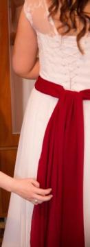 Ramiona i gorset są pokryte koronką, cały dół jest pokryty bardzo delikatnym, matowym jedwabiem. Pas z bordowego, matowego materiału można zawiązać na krawatkę tak jak u mnie, można zawiązać z tyłu na kokardę lub całkowicie go odczepić. Gorset jest mocny, ładnie modeluje sylwetkę, lecz jednocześnie suknia jest lekka.